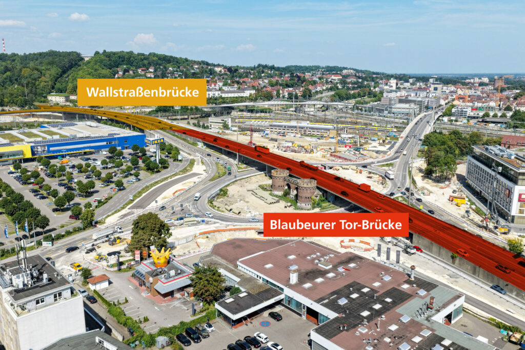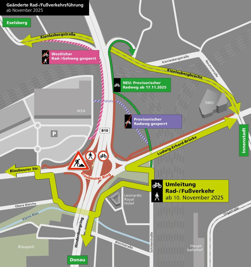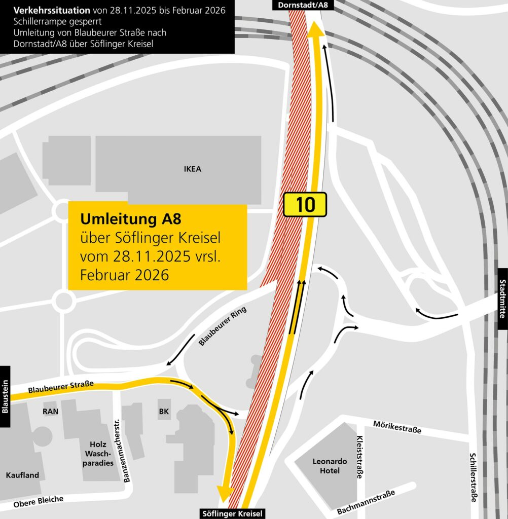 im November 2025 wird es aufgrund des Neubaus von Wallstraßenbrücke und Blaubeurer Tor-Tunnel am Blaubeurer Ring und auf der B10 mehrere unterschiedliche Verkehrssituationen für alle Verkehrsteilnehmer*innen geben: